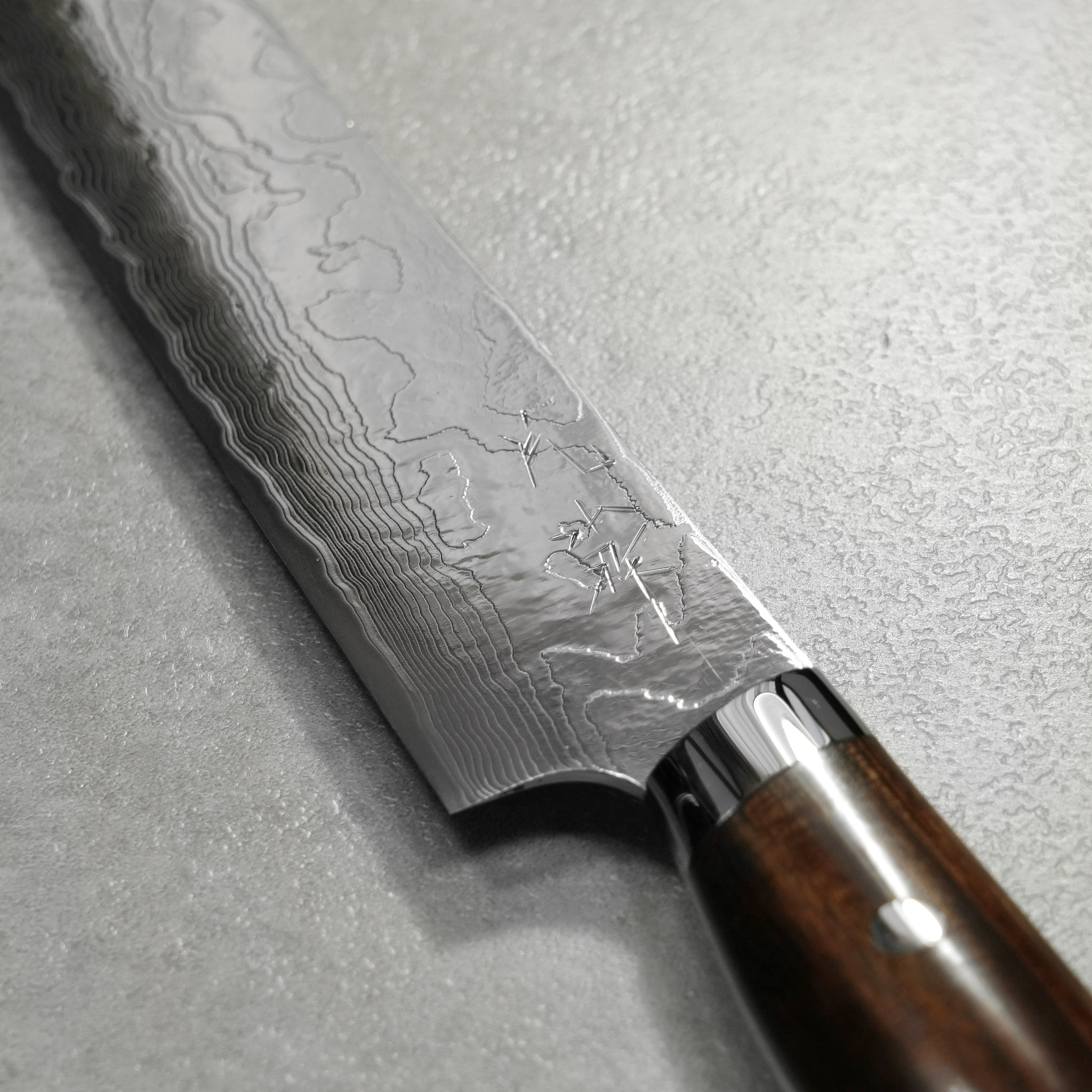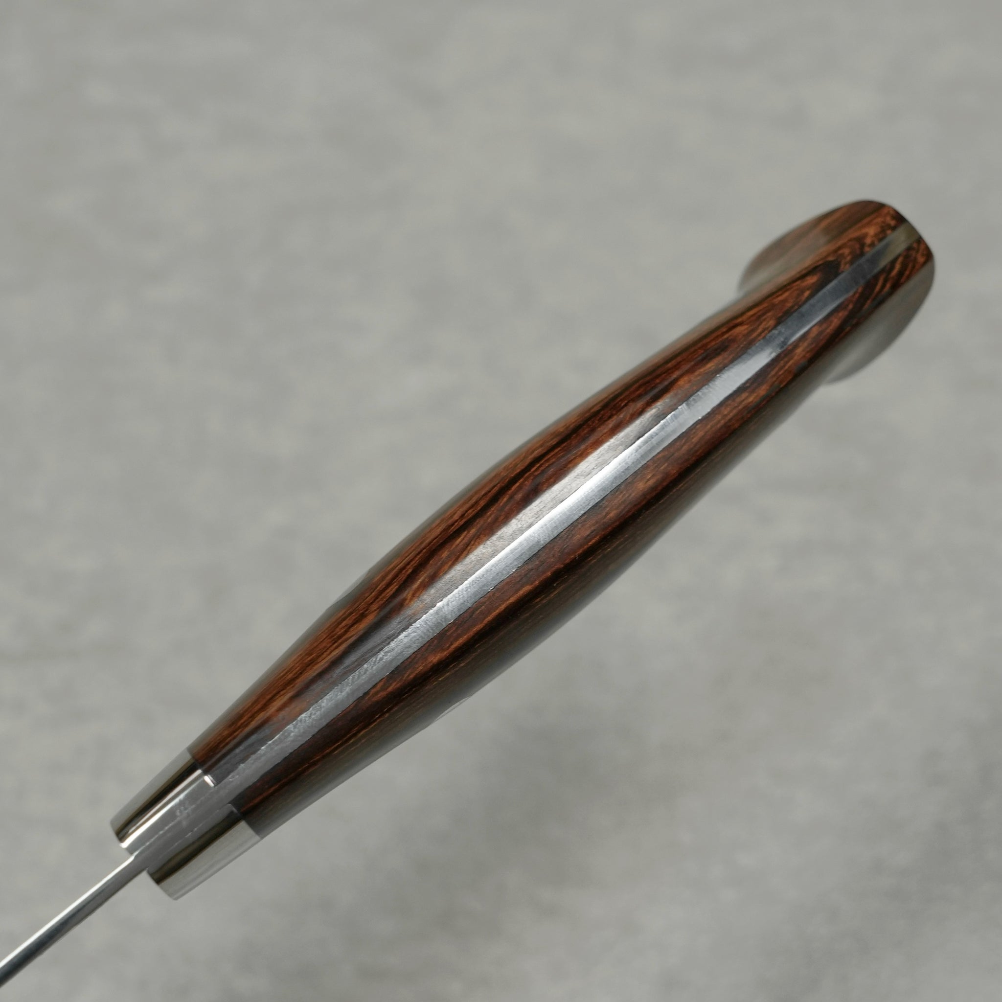 Mr. Katayama, a master craftsman based in Echizen City, creates exquisite custom field and kitchen knives. His designs are renowned for their ergonomic grip, striking aesthetics, and unparalleled originality. Indeed, many Japanese have never encountered such remarkable features as his acid-etched Damascus blades and knives with elegant ironwood handles.